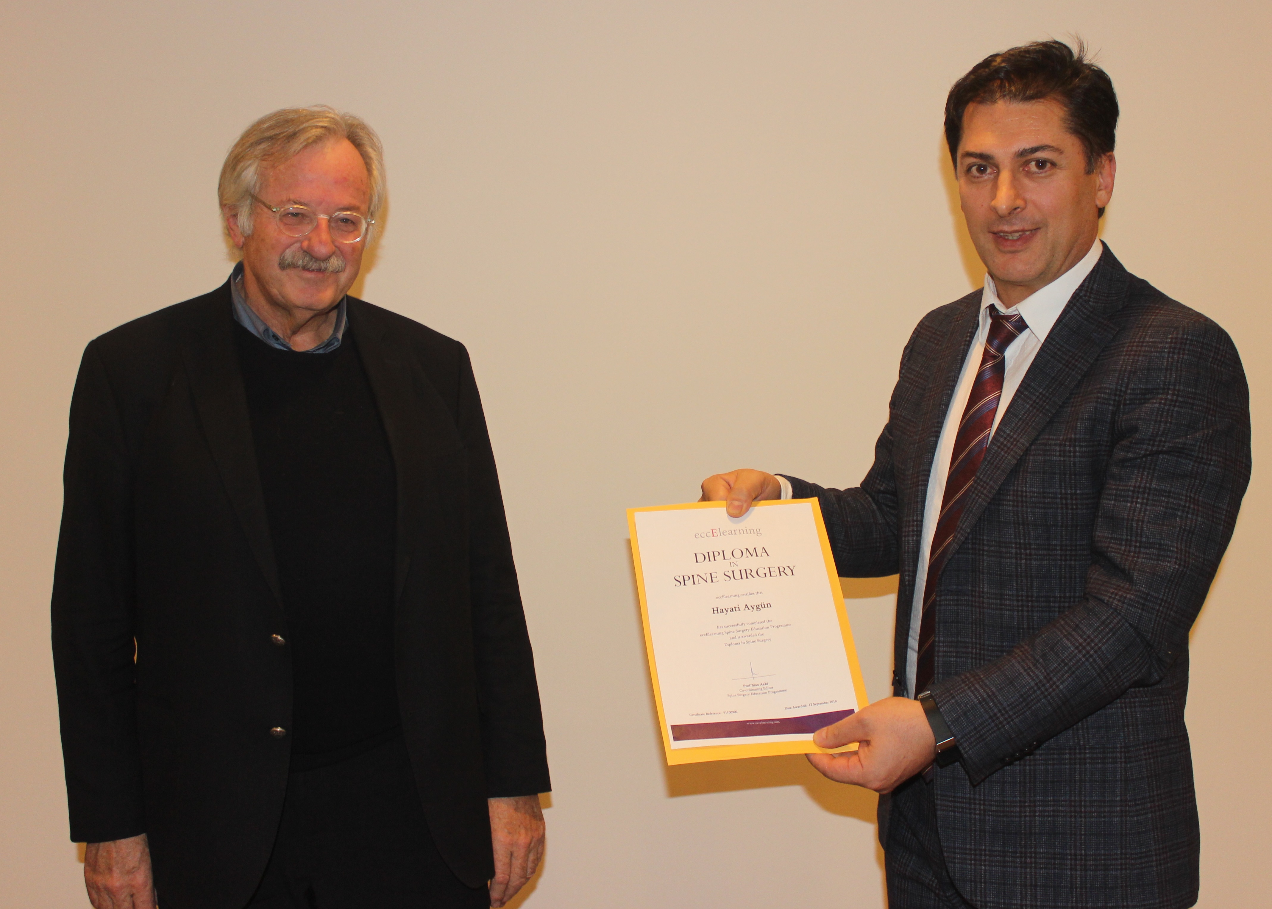 Sunumunun ardından katılımcıların sorularını da yanıtlayan Prof. Dr. Max Aebi’ ye, Özel Medicabil Hastanesi Yönetim Kurulu Başkanı Prof. Dr. Ömer Faruk Bilgen tarafından plaket takdim edildi. Programın sonunda eccElearning ‘’Omurga Cerrahisi Programını’’ başarıyla tamamlayan Doç. Dr. Hayati Aygün’ e, diplomasını eccElearning kurucusu Prof. Dr. Max Aebi verdi.